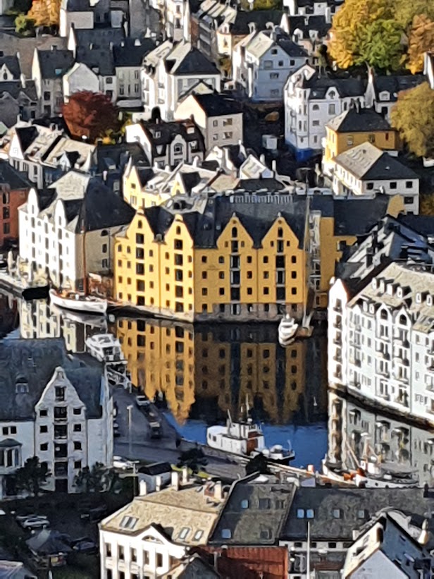 In 1902, large parts of Ålesund burned to the ground. About 10,000 of the 12,000 people were left homeless. It only took a few years before the city was rebuilt according to the most modern architecture of the time, which was Art Nouveau. The characteristic of Art Nouveau is various decorative elements – such as waves, arches and geometric shapes, as well as asymmetry, hipped roofs or mansard roofs and transom windows. According to the international museum organization ICOMOS, the Art Nouveau town of Ålesund is one of the most important cultural monuments in Norway from the 20th century. In the second half of the 19th century, the town grew on the basis of the fishing industry, and today Ålesund is the center of one of Norway’s largest and most modern sea fishing fleets. Ålesund is the regional center for the whole of Sunnmøre and an important export port. The most important export goods are fish, fish products, furniture and more. Ålesund is a large industrial municipality and the trade in goods and the provision of services are large industries. (Large Norwegian encyclopedia; Google translated).