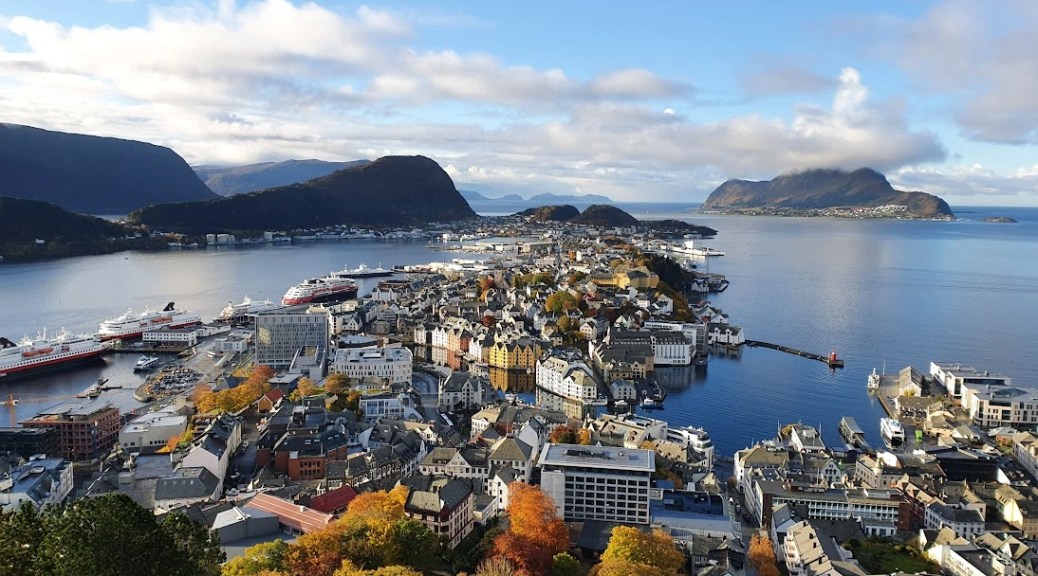 In 1902, large parts of Ålesund burned to the ground. About 10,000 of the 12,000 people were left homeless. It only took a few years before the city was rebuilt according to the most modern architecture of the time, which was Art Nouveau. The characteristic of Art Nouveau is various decorative elements – such as waves, arches and geometric shapes, as well as asymmetry, hipped roofs or mansard roofs and transom windows. According to the international museum organization ICOMOS, the Art Nouveau town of Ålesund is one of the most important cultural monuments in Norway from the 20th century. In the second half of the 19th century, the town grew on the basis of the fishing industry, and today Ålesund is the center of one of Norway’s largest and most modern sea fishing fleets. Ålesund is the regional center for the whole of Sunnmøre and an important export port. The most important export goods are fish, fish products, furniture and more. Ålesund is a large industrial municipality and the trade in goods and the provision of services are large industries. (Large Norwegian encyclopedia; Google translated).