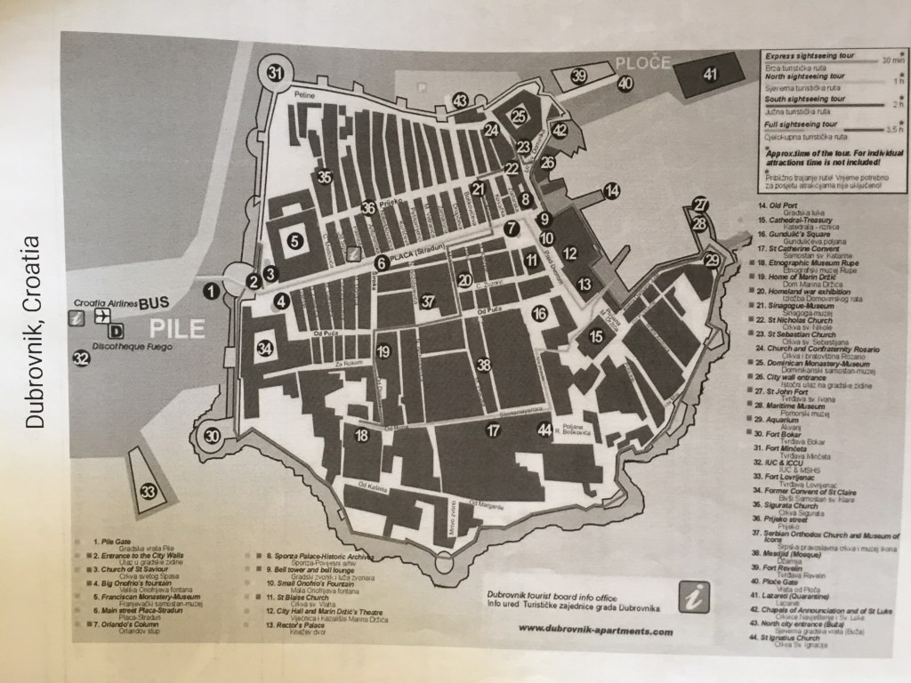 Vi har besøkt Dubrovnik to ganger i forbindelse med at vi har vært på cruise i Middelhavet. Det er alltid like fint å komme tilbake å oppleve den vakre og interessante byen – særlig gamlebyen. Det er spesielt å se de store festningsmurene som er reist på 1400 – 1500-tallet, og som omgir gamlebyen med tårn og bastioner (Store norske leksikon). Likedan var det interessant å vandre langs hovedgaten Plazaen som er i blankpolert marmor, samt alle de små og trange og krokete gatene i gamlebyen. På utsiktpunktet i gamlebyen er det en rekke uterestauranter og et yrende folkeliv. Vi anbefaler å besøke denne vakre byen – særlig gamlebyen.