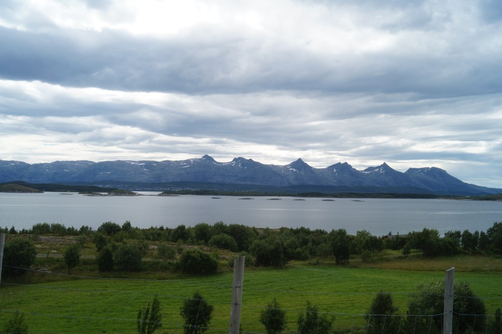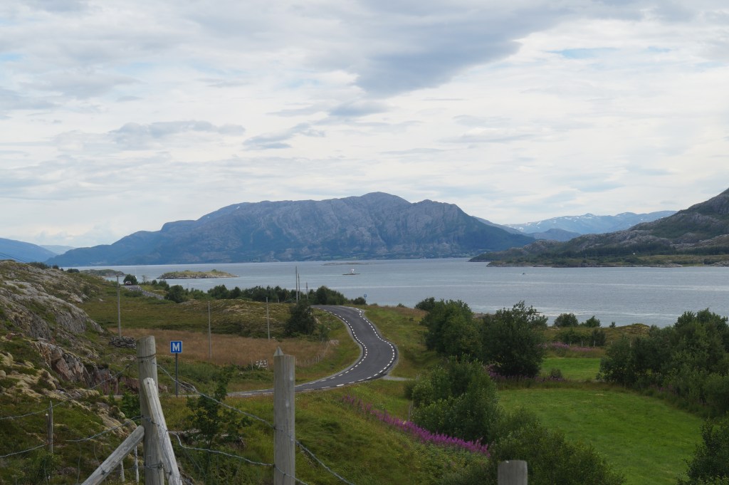 Vi kjørte bil fra Trondheim til Sandnessjøen og tok ferje ut til Dønna i 2017 i forbindelse med besøk til venner som bor der. Det er første gangen vi kjørte bil så langt nordover, og det var en uforglemmelig opplevelse å kjøre gjennom dette vakre landskapet. Vi kjørte også en tur rundt på øykommunen Dønna som har en stor skjærgård bestående av øyer, holmer og skjær. Her så vi Dønnmannen med sin spesielle fjellformasjon, Dønnes kirke, Dønnesfjellet med utsikt til Lovund og Træna og små fiskevær med mer. Den vakre naturen der var et fasinerende skue.