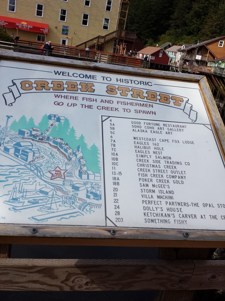 It was incredibly exciting and we were looking forward to getting to Ketchikan, which we have heard so much about from Norwegian-Americans who fished in Alaska. It is a great town where we wandered around and enjoyed the atmosphere with old wooden houses, small shops, watched the salmon swimming in the river in this beautiful landscape. Coming to Ketchikan made an impression on us and we want to go back there again. (Wikipedia; Google translated).